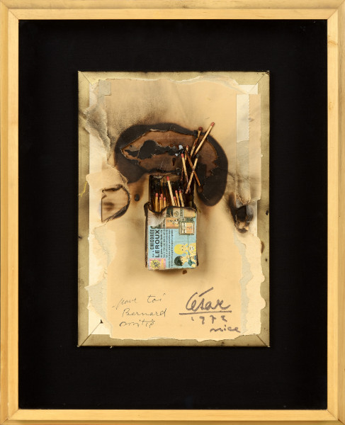 Boîte et allumettes calcinées, collage sur support cartonné signé, daté 1972, situé Nice en bas à droite et dédicacé en bas à gauche.