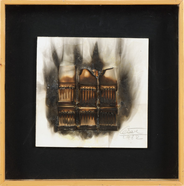 Allumettes calcinées, collage sur support papier signé et daté 1982 en bas à droite.