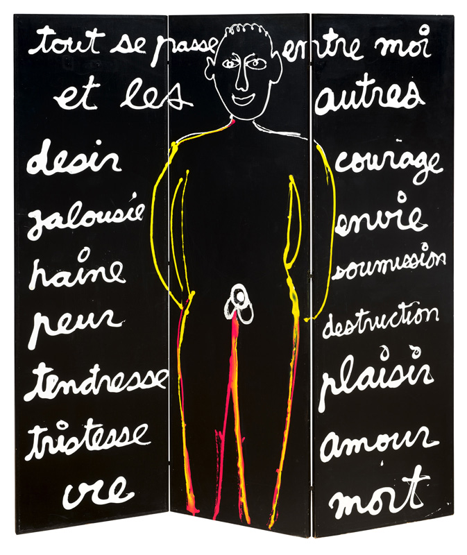 Le sexe est l’une des grandes obsessions de Ben Vautier. La thématique « Ben sex-maniac » est d’ailleurs un fil rouge dans le travail de l’artiste, tant le sexe est à l’origine de tout, de la vie même. L’artiste compose ici son propre cabinet de curiosités érotiques, fait d’objets dévoyés, tournés en dérision par l’appropriation de l’artiste, à l’image de cet austère portrait de femme qui lorgne un phallus qui lui est collé sous le nez. Ou de cette tapette à mouches destinée à fesser le cul de la photographie punaisée juste à côté, tentation qui se passe de mots. Le paravent érotique est un sacré morceau, liant le sexe à l’égo, l’amour à la mort, dans ce jeu de cache-cache sexuel, recto-verso : « l’envie, le désir, le plaisir se cache derrière les paravents ». L’hommage à Félix Faure, ainsi affectueusement intitulé en souvenir des circonstances du décès de cet ancien président français, surimpose à des ébats sexuels bucoliques qui figuraient sur une toile de maison-close, les mots, les phrases de l’artiste, dans un pêle-mêle joyeux et licencieux répondant à celui des corps qui s’ébattent. « Pas d’art sans sexe ». Ben s’amuse encore… du sexisme, du fétichisme, de la fidélité, de la vanité sexuelle, du désir enfin. « C’est la vie ».