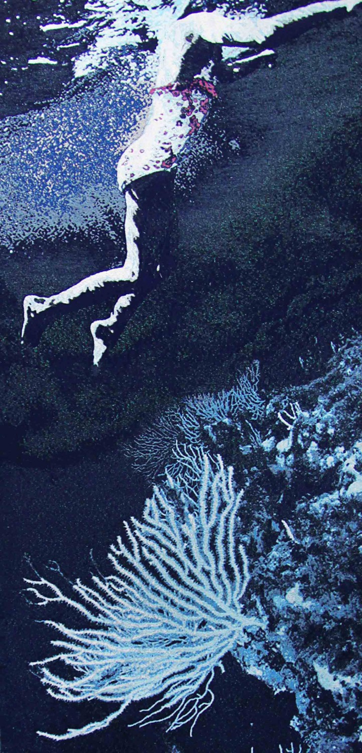 La verticalité des oeuvres nous immerge, nous plonge intensément dans un  univers maritime, flottant, où les corps sont en apesanteur.  Tiroir à double fond, un secret en cache un autre. L’artiste a tissé ses baigneurs de fils phosphorescents. Puisant à la lumière le jour, les corps luisent  somptueusement la nuit. Derrière un masque, en apnée, tapi près des coraux, dissimulé à la vue de  tous, l’enfant émerveillé retient son souffle le plus longtemps possible.  Longo Maï : pourvu que ça dure…