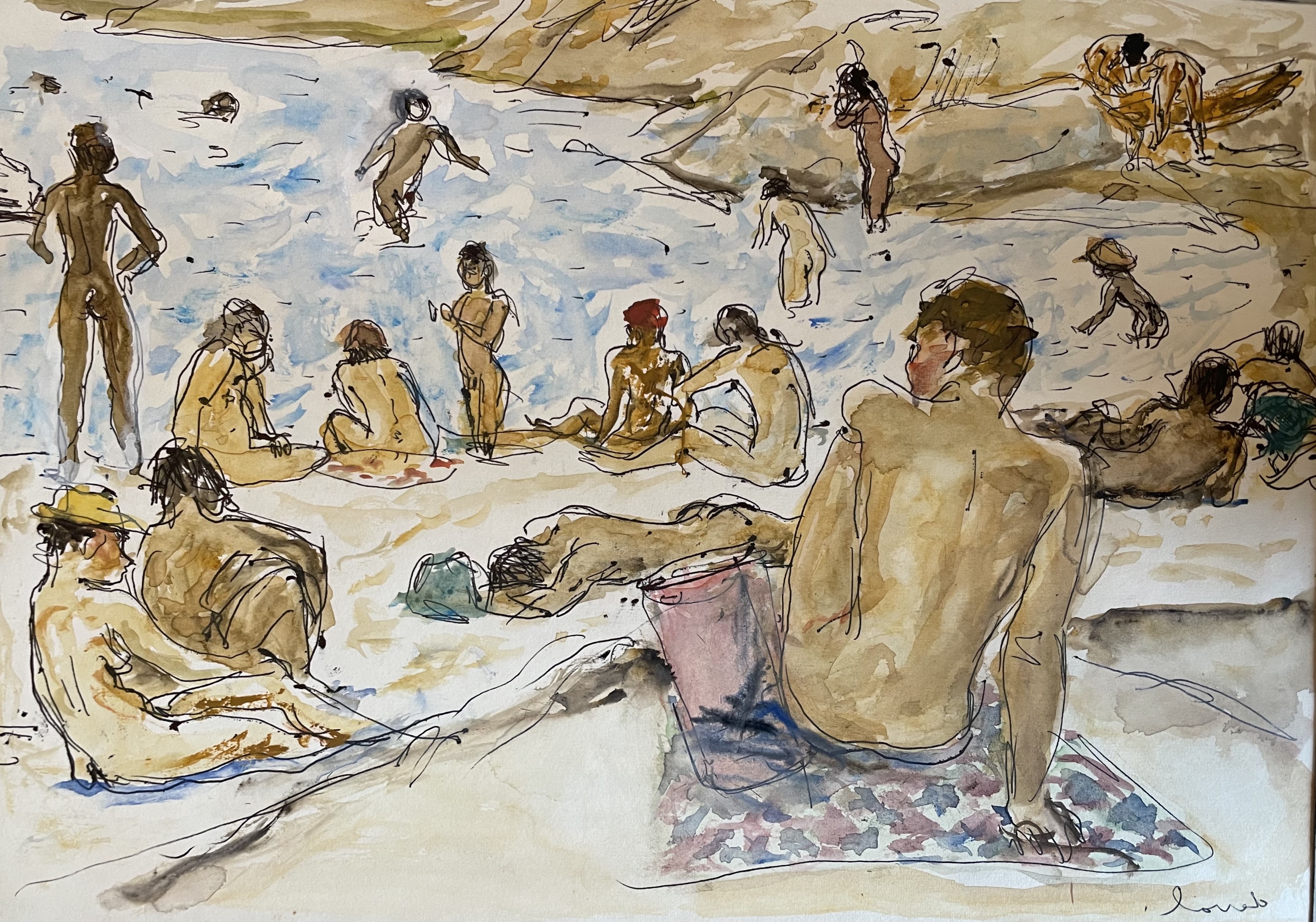 Aquarelle et encre sur papier, signée en bas à droite.