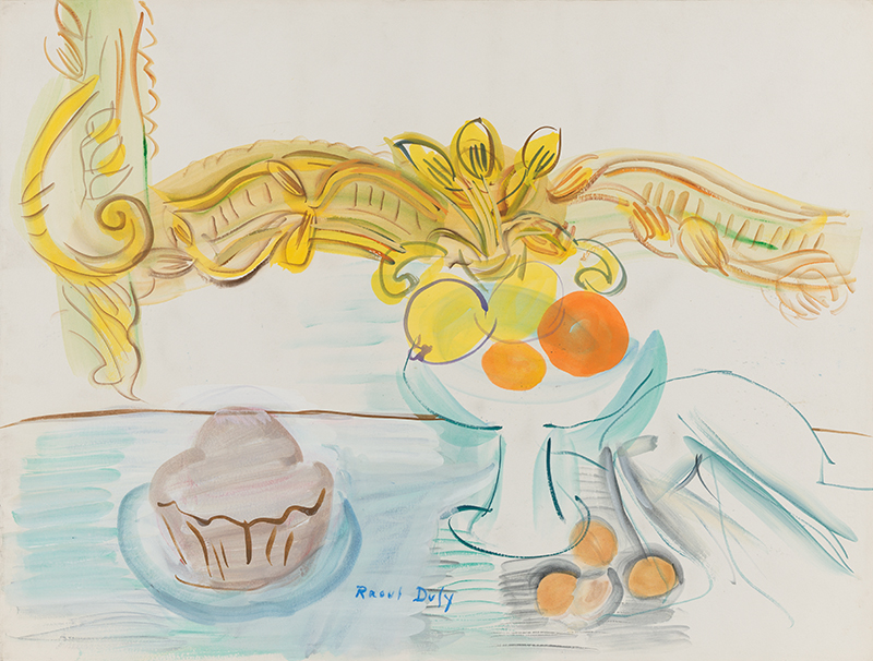 À la date à laquelle Dufy réalise cette aquarelle, cette brioche, gonflée et dodue, est sans douteune fête à elle seule, symbolisant le retour de temps plus cléments.