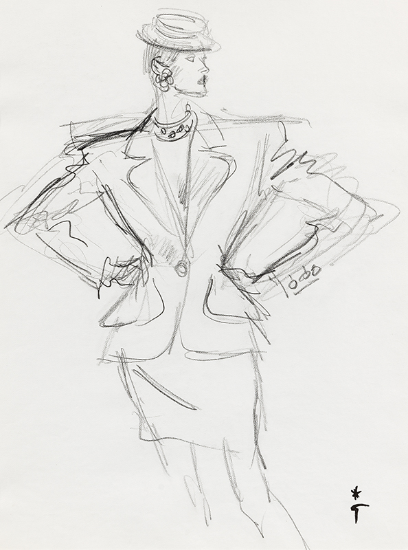 Projet pour l'illustration d'un article de mode paru dans la revue  Madame Figaro en 1987, modèle de tailleur de la maison Yves Saint Laurent.