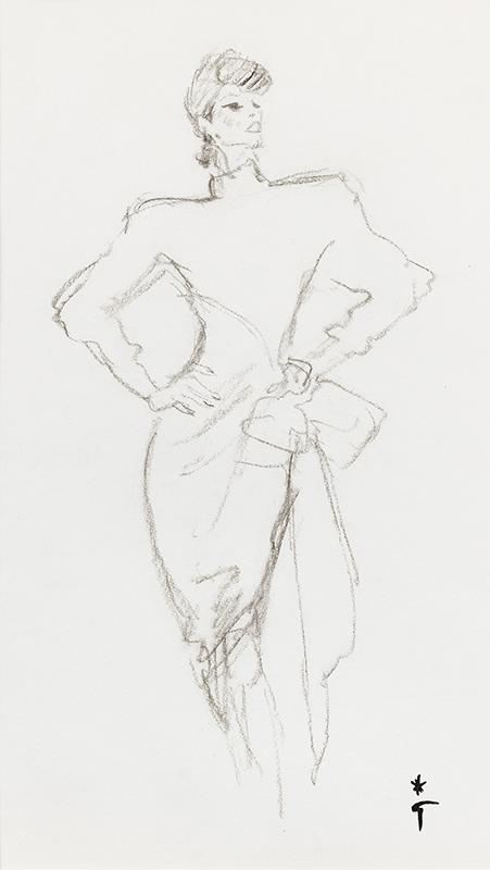 Etude pour une illustration parue dans Madame Figaro, 15 mars 1986, modèle d'une robe Guy Laroche.